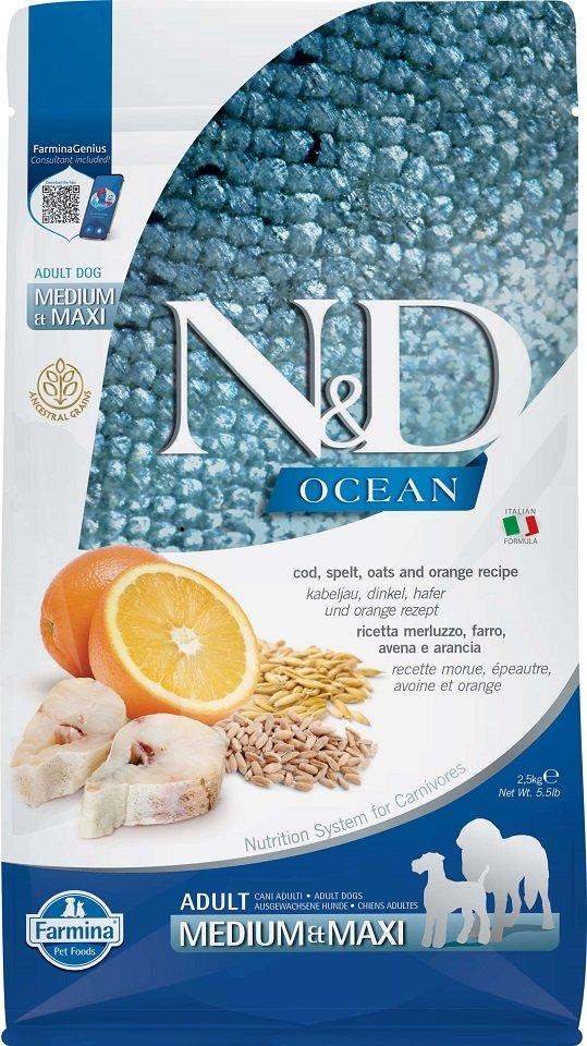 Farmina N&D Ocean Dog täiskasvanutele koertele tursk, kaer ja apelsin - täisteratoit keskmistele ja suurtele tõugudele.2,5kg