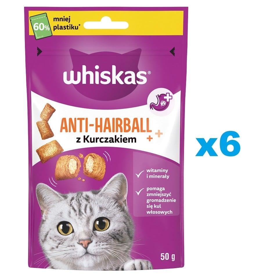 WHISKAS Anti-Hairball 6x50 g karvad eemaldavad maiustused täiskasvanud kassidele