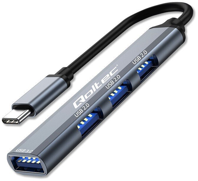 One HUB, unlimited possibilitiesAre you looking for a solution to extend the capabilities of your laptop or computer? The USB hub from Qoltec is dedicated to anyone who appreciates practical solutions that make it easier to organise work and use multiple devices at the same time. The lack of more USB ports on devices such as a laptop, for example, is a big problem. Right now, our device will improve and organise your workstation, you will gain the extra USB ports necessary to connect several devices at once. Interact seamlessly between devicesConnect multiple devices simultaneously and enjoy fast and reliable file transfer. Our hub allows you to connect additional devices and accessories to your computer, such as a mouse, keyboard, printer, flash drive, extra monitor, projector, headphones, speakers and more. With our device, you do not have to choose which device to disconnect in order to connect another one. The hub is equipped with a USB 3.0 port and 3 USB 2.0 ports. Multifunctionality in a compact sizeThe device's compact size makes it extremely practical and convenient, and its light weight will allow you to take it literally anywhere you need it, to work, the office or anywhere else on a business trip and beyond. It will easily fit into a pocket or backpack. The casing of the device is made of high-quality, durable aluminium, which further helps to dissipate heat and provides effective protection against crushing and protects against any damage.Forget drivers, enjoy full plug & play compatibilityIt's thanks to the Plug-and-Play feature, once connected to your laptop our device is ready to use without the need to install any additional drivers, just plug in the USB-C cable and you're good to go. The USB-C connector allows you to connect to any computer, laptop, tablet or smartphone equipped with a USB-C port or Thunderbolt 3 port that supports data transfer.Fast and reliable file transfer speedsDevices connected to the hub can transfer data at up to 5 gigabits per second, ensuring fast file copying, smooth data transfer between devices and efficient use of external drives. Remember the quality of the connected device or the type of cable also has its limits on data transfer speeds. Ensure that all devices connected to the Hub are USB 3.0 compatible and capable of handling high data transfer speeds.