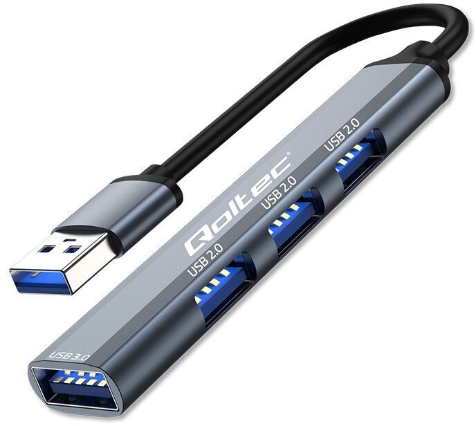 One HUB, unlimited possibilitiesAre you looking for a solution to extend the capabilities of your laptop or computer? The USB hub from Qoltec is dedicated to anyone who appreciates practical solutions that make it easier to organise work and use multiple devices at the same time. The lack of more USB ports on devices such as a laptop, for example, is a big problem. Right now, our device will improve and organise your workstation, you will gain the extra USB ports necessary to connect several devices at once. Interact seamlessly between devicesConnect multiple devices simultaneously and enjoy fast and reliable file transfer. Our hub allows you to connect additional devices and accessories to your computer, such as a mouse, keyboard, printer, flash drive, extra monitor, projector, headphones, speakers and more. With our device, you do not have to choose which device to disconnect in order to connect another one. The hub is equipped with a USB 3.0 port and 3 USB 2.0 ports. Multifunctionality in a compact sizeThe device's compact size makes it extremely practical and convenient, and its light weight will allow you to take it literally anywhere you need it, to work, the office or anywhere else on a business trip and beyond. It will easily fit into a pocket or backpack. The casing of the device is made of high-quality, durable aluminium, which further helps to dissipate heat and provides effective protection against crushing and protects against any damage.Forget drivers, enjoy full plug & play compatibilityIt's thanks to the Plug-and-Play feature, once connected to your laptop our device is ready to use without the need to install any additional drivers, just plug in the USB-C cable and you're good to go. Fast and reliable file transfer speedsDevices connected to the hub can transfer data at up to 5 gigabits per second, ensuring fast file copying, smooth data transfer between devices and efficient use of external drives. Remember the quality of the connected device or the type of cable also has its limits on data transfer speeds. Ensure that all devices connected to the Hub are USB 3.0 compatible and capable of handling high data transfer speeds.