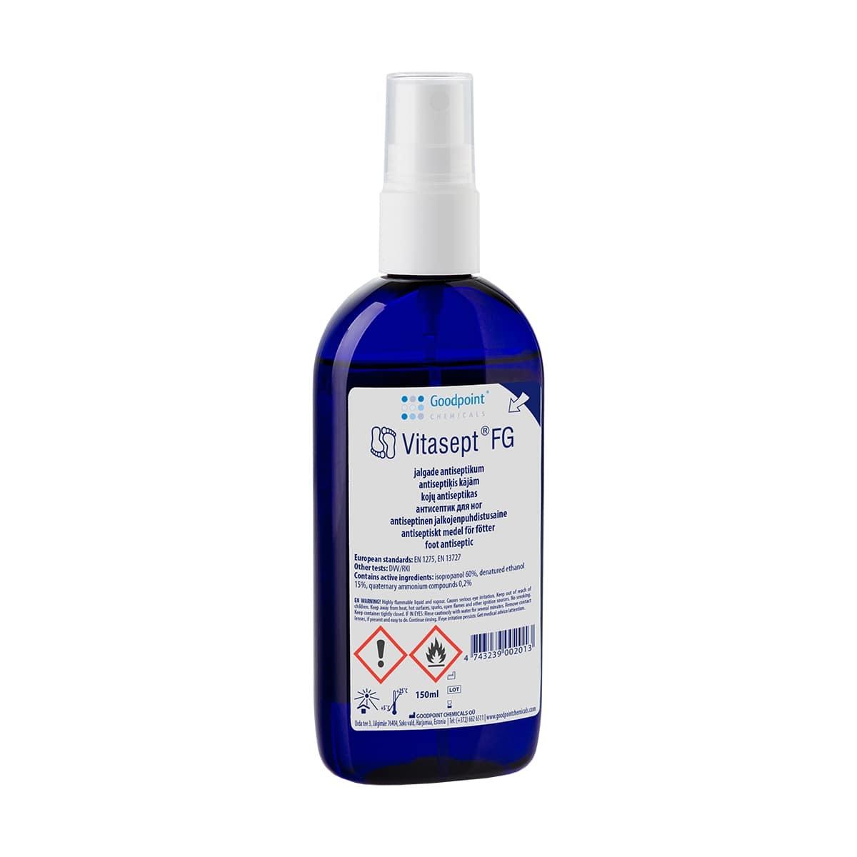 Tootetutvustus, kasutusviis VITASEPT®FG likvideerib naha ja küünte seenhaiguste jaoks sobiva keskkonna, vähendab jalgade liighigistamist ja sellest tulenevat ebameeldivat lõhna. TOOTE OMADUSED * alkoholibaasiline * sisaldab nahahooldusvahendeid * toimib kiiresti ja efektiivselt * vähendab jalgade liighigistamist TOIMEAEG 30 sekundit MIKROBIOLOOGILINE TOIMESPEKTER Toode on bakteritsiidne, tuberkulotsiidne, pärmseentevastane, omab virutsiidset toimet ümbrisega viiruste (sh HBV, HIV, HCV, koroona-,...