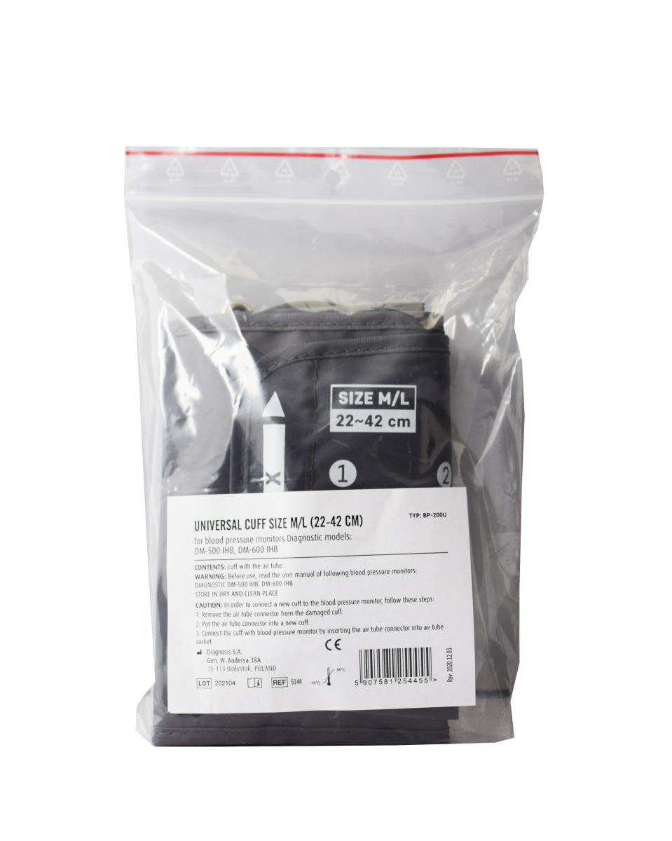Vererõhuaparaadi Diagnostic mansett suurus M/L. Sobib õlavarre ümbermõõdule 22-42cm. Pehme. Kasutamisjuhised Sobib järgnevatele Diagnostic vererõhuaparaatidele: DM-200 IHB Plus, DM-500 IHB, DM-600 IHB, Pro Afib, 100-BT Hoiatused ja ettevaatusabinõud Hoiustada kuivas ja toatemperatuuril. Seadme ja pakendi sisu Mansett+voolik (ilma ühenduslülita) Tootja või tootja volitatud esindaja Diagnosis S.A. ul. Gen. W. Andersa 38A, 15-113 Białystok, POOLA www.diagnosis.pl Päritoluri...