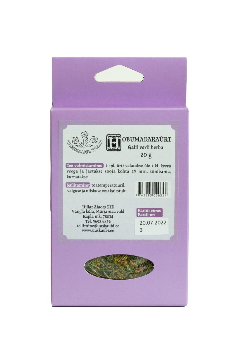Tootetutvustus Kuivatatud hobumadara lehed, varred ja õied. Galii veri herba. Päevaseks tarbimiseks soovitatav kogus ning tarvitamisjuhised Tee valmistamine: 1 spl. ürti valatakse üle 1 klaasi keeva veega ja jäetakse sooja kohta 45 minutiks tõmbama, kurnatakse. Juuakse 2 klaasi teed päevas. Sisaldus päevase annuse kohta 6 g Koostisosade loetelu (allergiat või talumatust põhjustav koostisosa või abiaine märgitud TRÜKITÄHTEDES) Kuivatatud hobumadaraürt. Hoiatused Mitte kasutada rasedatel ja rinnag...