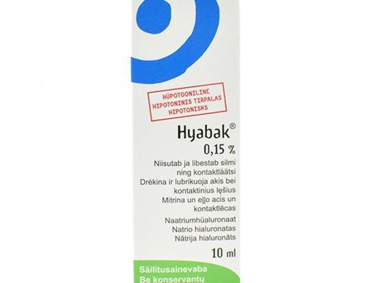 Taastab silma loomuliku hüpotoonilise ja osmootse pisaravedeliku tasakaalu. Võib kasutada kontaktläätsede kadmise ajal. Sisaldab silmas loomulikult esinevat polüsahhariidi naatriumhüaluronaati, mis niisutab ja libestab silmi, säilitades silma niiskuse ja andes kestvama mugavustunde. Hyabak-s sisalduv aktinokinool omab kaitsevõimet UV kiirguse eest. Hyabak-i soovitatakse: - silmade niisutamiseks, libestamiseks silmade kuivuse või väsimuse korral, mis on tingitud välistest teguritest nagu tuul, suits, saaste, kuiv õhk, õhu konditsioneerimine, lennureisid, pikaajaline arvutiga töötamine jne. - mis tahes tüüpi kontaktläätsede kandjatele, et muuta läätsede silmapanek ja äravõtmine lihtsamaks ning toetada kandmismugavust terveks päevaks. Säilitusainevaba koostise tõttu ei kahjusta Hyabak silmakude. Säilitamistingimused: hoida toatemperatuuril kuni 25 C°. Tootja või tootja volitatud esindaja B&L GROUP SIA, Läti Päritoluriik: Prantsusmaa