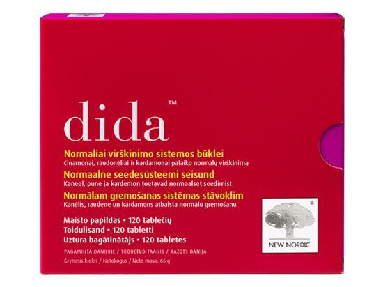 Dida koostises on ravim- ja maitsetaimi, millel on antiseptiline, gaaside teket, venitustunnet ja puhitust vähendav toime. Kaneel, pune, küüslauk, nelgipuu õied, kardemoni viljad ning oliivipuu lehed on antiseptilise toimega ja pärsivad kahjuliku mikrofloora vohamist. Piparmünt ja apteegitill vähendavad kõhupuhitust ja venitustunnet ning aitavad lahti saada raskustundest maos pärast sööki. Niatsiin aitab hoida limaskestade normaalset seisundit. Soolestiku ja seedimissüsteemi limaskestade seisund on hea enesetunde seisukohalt väga tähtis. 120 tabletti. Netokogus: 116,2 g TOOTJA New Nordic Healthbrands AB, Södra Förstadsgatan 3C, S-211 43, Malmö, Rootsi.