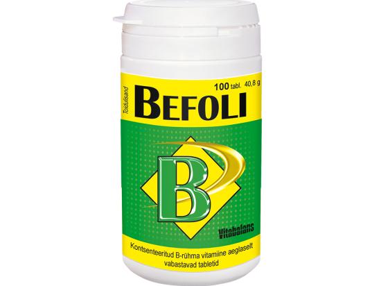 B-vitamiinid osalevad peaaegu kõigis organismi ainevahetusprotsessides. Nad etendavad olulist osa nii süsivesikute, valkude kui rasvade ainevahetuses, kui ka organismi energia tootmises. B-vitamiine on vaja lihaste töös, närvisüsteemi funktsioneerimises ja vererakkude tekkeks. Tiamiin (vitamiin B1) aitab kaasa normaalsele energiavahetusele ja närvisüsteemi talitlusele, aitab kaasa normaalsele südametalitlusele. Riboflaviin (vitamiin B2) aitab hoida normaalset nägemist ja kaitsta rakke oksüdatiivse stressi eest. Niatsiin (vitamiin B3) aitab kaasa normaalsele energiavahetusele ja närvisüsteemi talitlusele, aitab hoida limaskesti ja nahka normaalsetena, aitab vähendada väsimust ja kurnatust. Pantoteenhape (vitamiin B5) aitab kaasa normaalsele vaimsele jõudlusele ja energiavahetusele. Vitamiin B6 aitab kaasa normaalsele homotsüsteiini, valgu- ja glükogeeniainevahetusele. Vitamiin B12 osaleb rakujagunemise protsessis, aitab kaasa vere punaliblede normaalsele moodustumisele ning immuunsüsteemi talitlusele. Biotiin aitab kaasa makrotoitainete ainevahetusele ja aitab hoida nahka, limaskestasid ning juukseid normaalsena. Folaat (foolhape) osaleb rakujagunemise protsessis, aitab kaasa normaalsele vereloomele ja aminohapete sünteesile Igapäevane B-vitamiinide saamine on vajalik, kuna veeslahustuvate vitamiinidena neid organismis suurte varudena ei säilitata. Befoli sisaldab suurtes kogustes organismile kõige enam vajaminevaid B-vitamiine. Lisaks on tablett valmistatud nii, et vitamiinid vabanevad tabletist aeglaselt, tagades seeläbi parema imendumise ja pikajalise toime. Netokogus: 40,8g (100tabletti) Tootja: Vitabalans OY, Soome