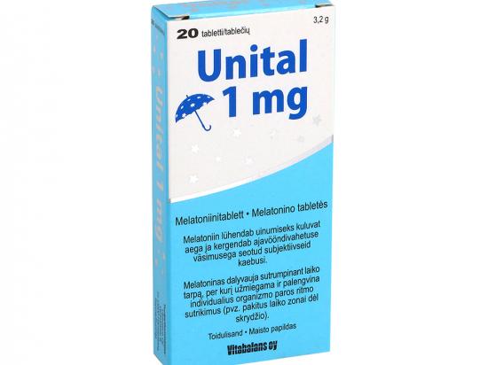 Melatoniin aitab lühendada uinumisaega Melatoniin alandab keha temperatuuri ja erksusastet ning tekitab uinumisele eelneva väsinud ärkveloleku seisundi, mis soodustab uinumist. Suu kaudu manustatav melatoniin lihtsustab uinumist, kui selle takistuseks ei ole mingi füüsiline või vaimne põhjus. Ka eakamatel inimestel aitab melatoniin uinuda, seda eriti juhul, kui organismis endas toodetud melatoniini kogus on väike. Melatoniin aitab leevendada ajavahest tingitud vaevusi Ajavahest tulenevad probleemid tekivad organismi bioloogilise kella häirituse korral, kui lennatakse vähemalt üle nelja ajavööndi. Ajavahega seotud tavalisemad vaevused on nt väsimus, ärritumine, keskendumisraskused, hajameelsus, kurnatus ja söögiisu puudumine. Ida suunas lendamine avaldab pikemat mõju kui lääne suunas lendamine. Melatoniini manustamine paari päeva jooksul pärast lendu leevendab tekkivaid sümptomeid ja aitab taastada organismi sisemise rütmi. Melatoniin (nn unehormoon) on une ja ärkveloleku rütmi reguleerimisel osalev hormoon, mis eritub peamiselt aju käbinäärmest. Melatoniini eritumine on päevasel ajal vähene, õhtul see suureneb ja saavutab tipptaseme öösel ajavahemikul 02.00–04.00 ning hakkab seejärel jälle vähenema. Eritumine on ka vanuseti erinev: imikutel ja väikelastel on melatoniini eritumine väga rohke kuid see tasakaalustub murdeeas. Täiskasvanutel eelnevalt nimetatud melatoniini eritumise rütm säilib kuid öine eritumine hakkab vananemisel järk-järgult vähenema ning eakatel enam öise ja päevase melatoniini eritumise erinevust ei ole. Igas vanuses inimestel võib melatoniini eritumises olla ka üsna suuri individuaalseid erinevusi. Netokogus 3,2 g / 20 tabletti. Tootja: Vitabalans OY, Varastokatu 8, FI-13500, Hämeenlinna. Maaletooja: Vitabalans Pharma OÜ, Hõbekuuse tee 26, 12111 Tallinn. Päritoluriik: Soome.