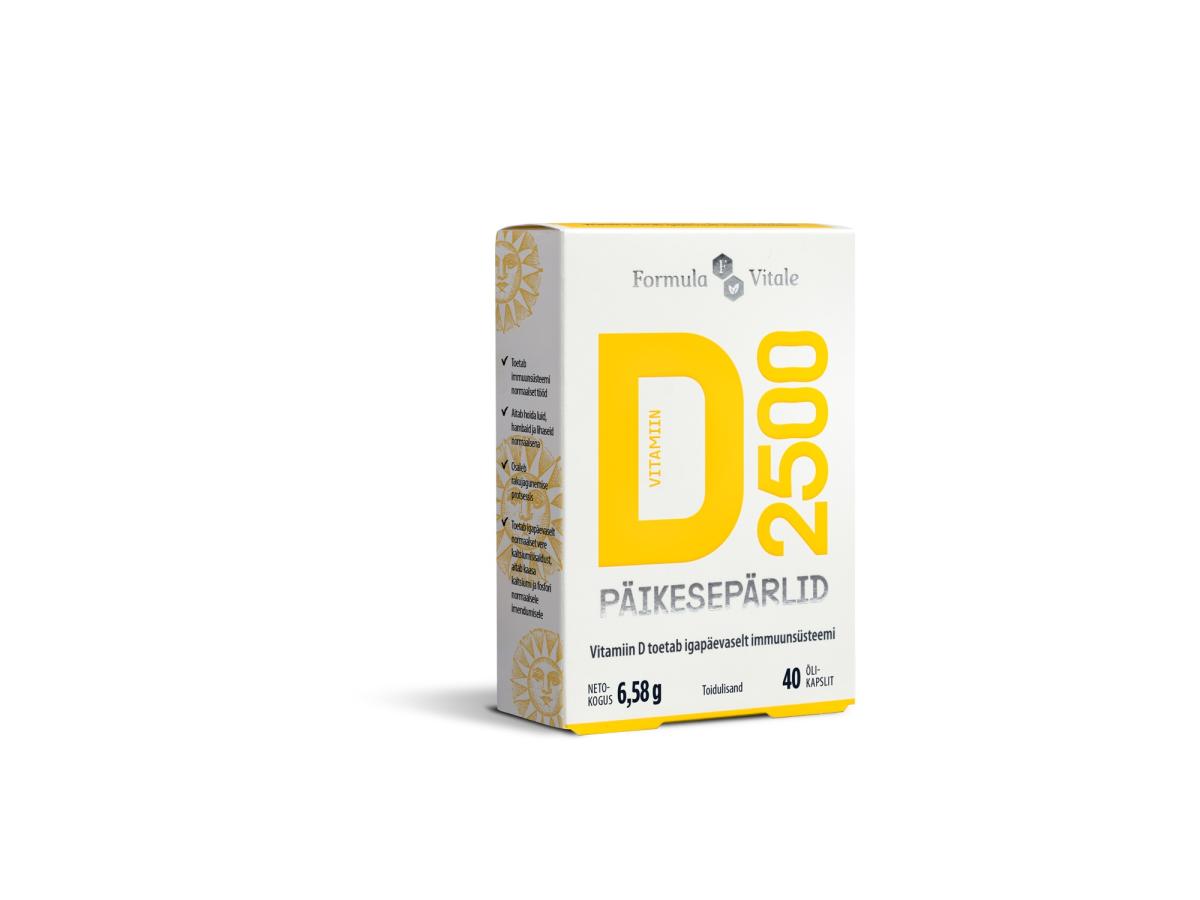 Tootetutvustus Vitamiin D aitab hoida luid, lihaseid ja hambaid normaalsena. Vitamiin D aitab kaasa immuunsüsteemi normaalsele talitlusele ning kaltsiumi imendumisele organismis. Päevaseks tarbimiseks soovitatav kogus ning tarvitamisjuhised Täiskasvanud ja lapsed alates 12ndast eluaastast 1 kapsel päevas. Sisaldus päevase annuse kohta Päevane annus 1 kapsel sisaldab: %NRV* D3 vitamiin 62,5 µg / 2500IU** (1250%*) *%NRV - protsent päevasest võrdluskogusesttäiskasvanutele **rahvusvaheline toimeuhik...