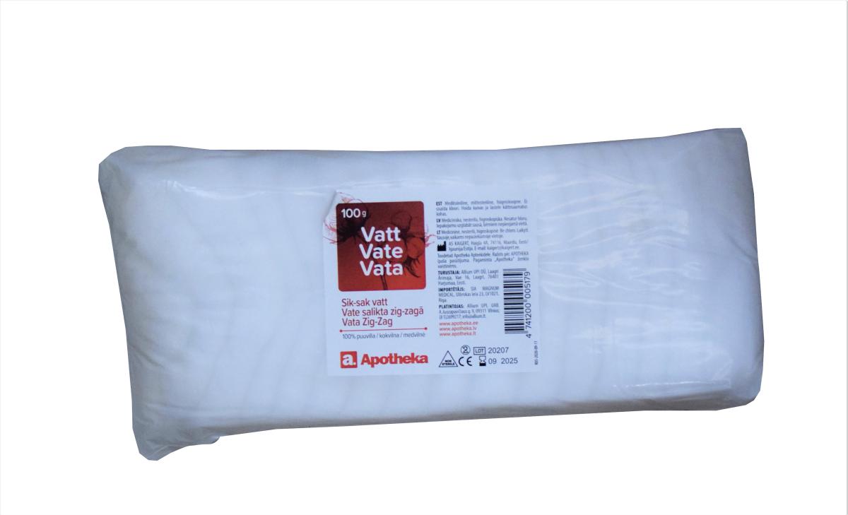 Sik-sak vatt. Kasutamisjuhised Meditsiiniline, mittesteriilne, hügroskoopne. Koostisosade loetelu 100% puuvilla. Ei sisalda kloori. Hoiatused ja ettevaatusabinõud Hoida lastele kättesaamatus kohas. Säilitamistingimused Hoida kuivas kohas. Seadme ja pakendi sisu 100 g Tootja või tootja volitatud esindaja Tootja: AS KAIGERT, Haigla 4A, 74116, Maardu, Eesti. E-mail: kaigert@kaigert.ee. Toodetud Apotheka apteekidele. Turustaja: Allium UPI OÜ, Laagri Ärimaja, Vae 16, Laagri, ...