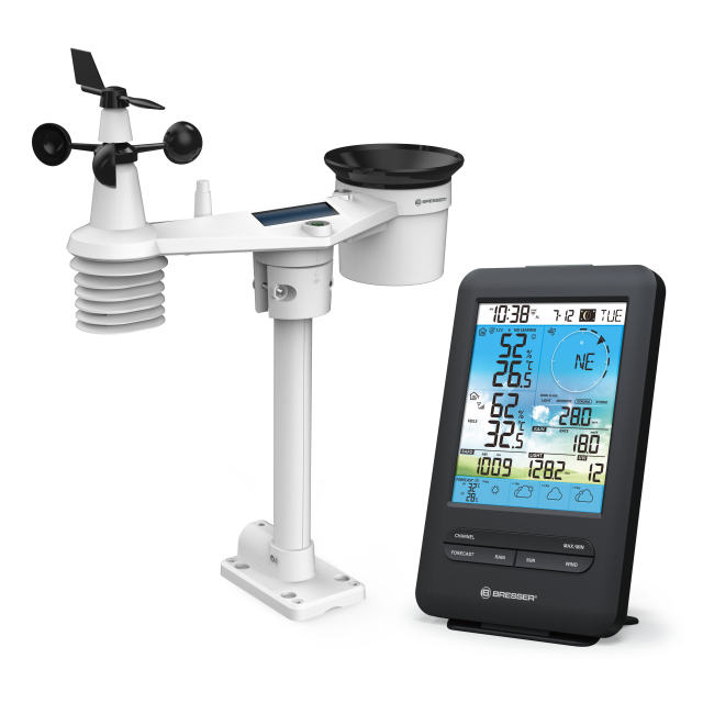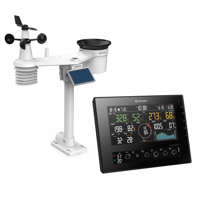 Seitse ühes anduriga Wi-Fi-ilmakeskus BRESSER Profi-WSC - (7003360) - Mõõdab kohalikku välistemperatuuri, õhuniiskust, tuule kiirust ja suunda, sademete hulka, UV-taset ja valguse intensiivsust. Praktiline ja keskkonnasõbralik: välisandur on varustatud ka päikesepaneeliga, et pikendada patarei kasutusiga.