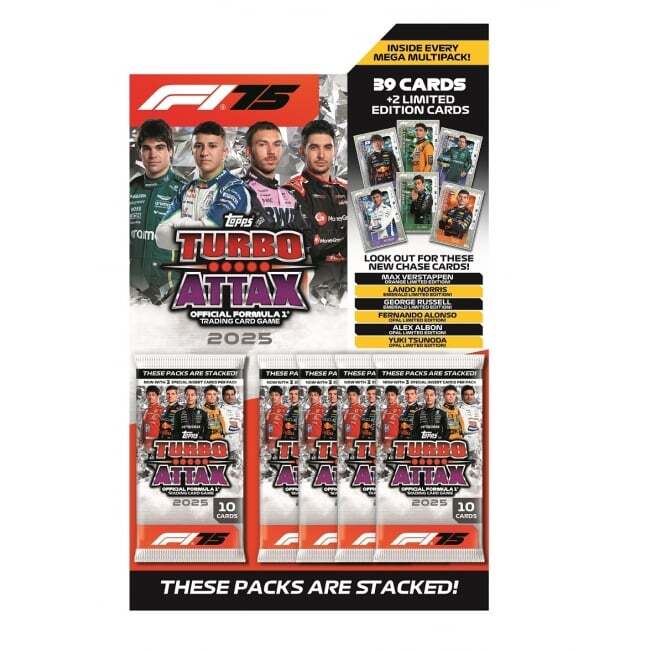 Topps Turbo Attax 2025 – uued F1 kogumiskaardid. Avasta üle 400 uue kaardi ja põnevad kategooriad, nagu Rainmaster, Team Dynasty, Rookie Rising, Pole Position ja paljud teised. Tagasi on ka armastatud seeriad, sh 100 Club, Stars of Tomorrow, Epic Moments ning suurim Legends-kogu 18 ikoonilise kaardiga. Sel hooajal tähistatakse F1 75. aastapäeva haruldaste Diamond Pull kaartide ja eksklusiivse Diamond Edition Mega Tin kollektsiooniga, kust võib leida ka Legend Relic kaardi. Lisaks ootavad Sind piiratud väljaande erivärvid ja Diamond paralleelid. Ideaalne kingitus ja täiendus kogule igale F1 fännile!