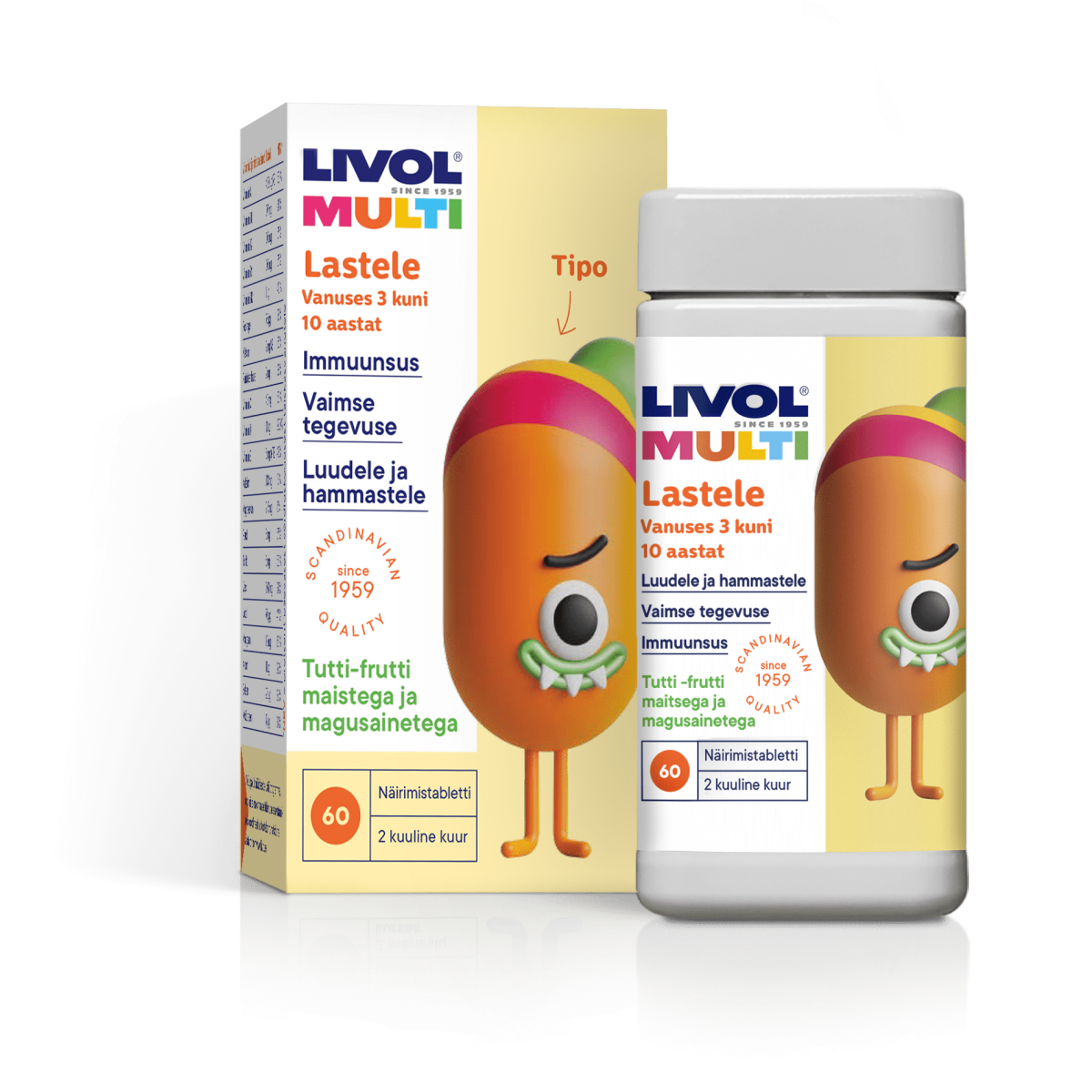 LIVOL MULTI närimistabletid lastele on tutti frutti maitsega toidulisand 3- kuni 10-aastastele lastele. Esimesed kümme aastat on eriti tähtis periood kasvava lapse elus, kuna selle aja jooksul arenevad luud, hambad, lihased ja aju funktsioonid. Laps peab saama kasvamiseks piisavalt kõiki vajalikke vitamiine ja mineraalaineid. Koostises on 10 väärtuslikku komponenti (nt vitamiinid A, C, D), mis toetavad lapse immuunsüsteemi normaalset talitlust. C- ja D-vitamiinid aitavad hoida luid ja hambaid normaalsetena. Pantoteenhape aitab kaasa lapse normaalsele vaimsele jõudlusele. A-vitamiin, riboflaviin ja tsink aitavad hoida normaalset nägemist. Raud, B6 ja B12 vitamiinid osalevad normaalsete vere punaliblede moodustamisel ja riboflaviin aitab säilitada punaseid vereliblesid normaalsena. C- ja B-vitamiinid ning vask aitavad kaasa laste kesknärvisüsteemi normaalsele toimimisele. Hoiatused:Ülemäärane tarbimine võib põhjustada kõhulahtisust!Oluline on toituda mitmekülgselt ja tasakaalustatult ning harrastada tervislikku elustiili!Mitte ületada päevaseks tarbimiseks soovitatavat kogust!Toidulisandit mitte kasutada mitmekesise toitumise asendajana!Hoida toodet lastele kättesaamatus kohas!